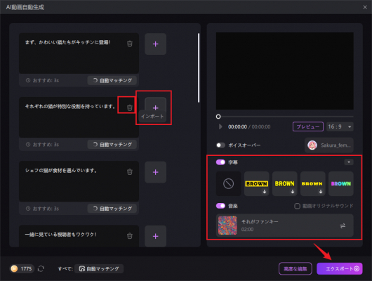 AIがシナリオを分析し、最適な映像、音声、BGM、エフェクトを自動で組み合わせます。