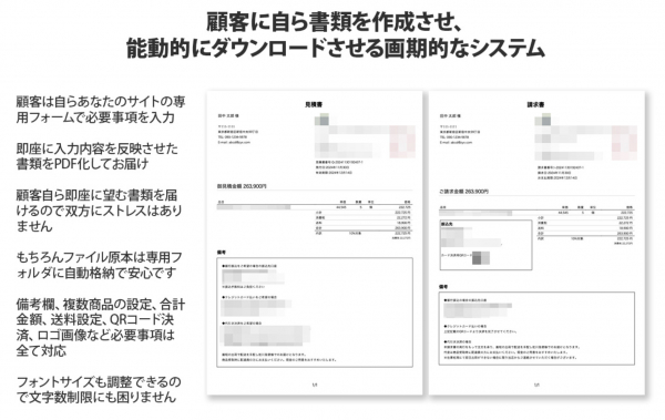 顧客が自ら見積書・請求書を発行できる画期的システムで毎月5件以上の見積書・請求書発行業務が発生するサイト運営者に最適です。問い合わせ対応ゼロ&売上増加を実現します。