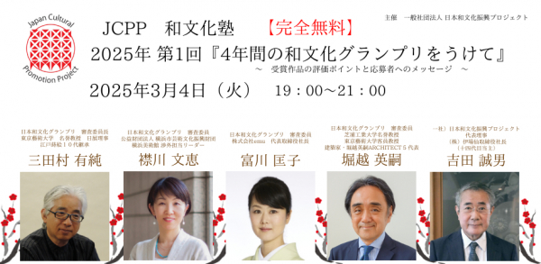 今回の『和文化塾』2025年度第1回では、2024年度の第4回日本和文化グランプリの受賞・入選作品について、審査委員がその魅力を余すところなく解説します。昨年も大変ご好評をいただいたテーマですので、今年も多くの皆様にご参加いただけることを楽しみにしています。