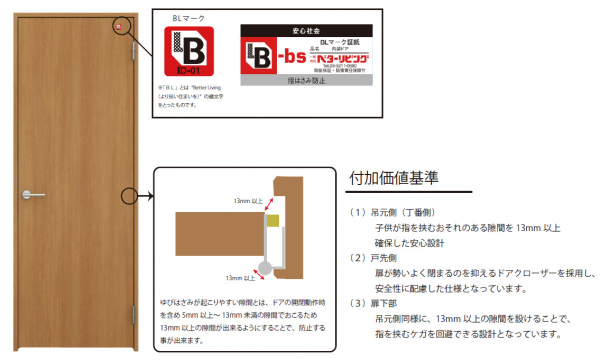 これは、2023年6月にBL(優良住宅部品)認定を取得した「内装ドア」に、指はさみ防止機能を追加した型式として認定されたものです。
