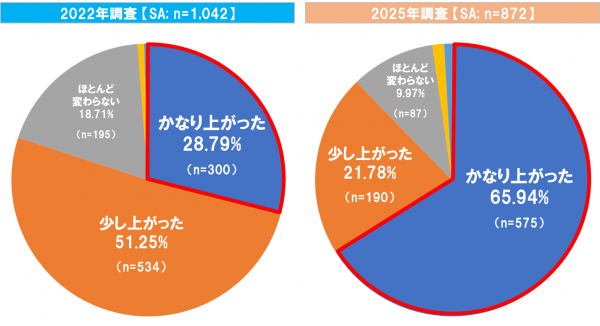 「1年前と比べて、身近な商品・サービスの提供価格(物価)がどう変わったと感じるか」という質問に対して、2025年調査における子育て世帯の8割強が、「物価が上昇している」と感じていることが分かった。その中でも、物価が「かなり上がった」と実感している割合は2022年調査と比べ31.75ptも上昇している(図1)。