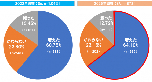 「現在と1年前の同時期をくらべて、世帯の支出(出費)がどう変わったか」という質問に対して、2025年調査における子育て世帯の6割が「支出が増えた」と回答した。2022年調査と比べるとほぼ変化はなかった(図2)。