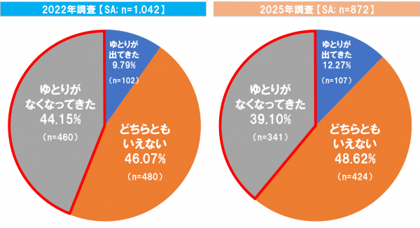 「現在と1年前の同時期をくらべて、暮らし向き(家計の状態)はどう変わったか」という質問に対して、2025年調査における子育て世帯の4割が「家計にゆとりがなくなってきた」と回答した。2022年調査と比べると、「ゆとりがなくなってきた」と回答した割合は3年前に比べ5.05pt減少しているものの、暮らし向きにゆとりが出てきたというわけではないだろう(図3)。