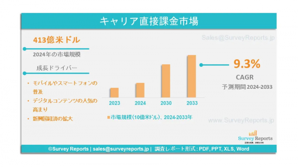 Surveyreportsの専門家は、キャリア決済市場の調査を分析し、2024年のキャリア決済市場規模は413億米ドルに達すると予測した。さらに、直接キャリア課金市場のシェアは、2033年末までに1078億米ドルに達すると予測されている。直接キャリア課金市場は、2024年から2033年の予測期間にわたって、年間平均成長率(CAGR)約9.3%で成長すると予測されている。