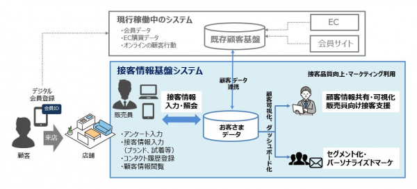 また、現行の顧客基盤の顧客データと「接客情報基盤システム」で取得するデータを連携することで、販売員向けの接客支援や顧客へのパーソナライズドマーケティングも可能になります。