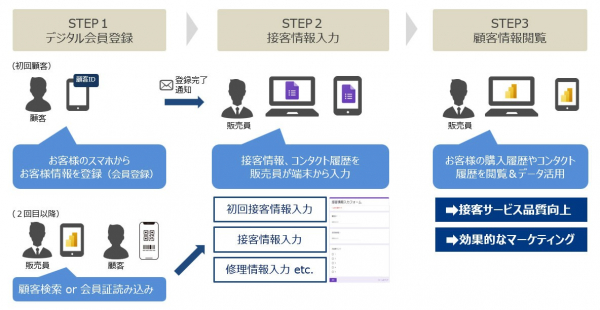 店舗・販売員の接客情報の入力から、既存顧客基盤との連携による接客情報、購買履歴などのデータ閲覧・活用までを、一括して提供。店舗内でのセキュアかつスムーズな情報共有・利用が可能になります。