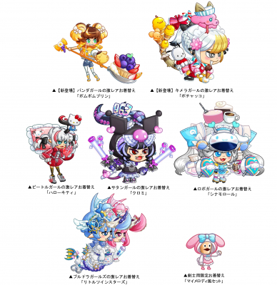 「コラボのアバたま」にコラボ限定のパンダガールの激レアお着替え「ポムポムプリン」、キメラガールの激レアお着替え「ポチャッコ」が新しく登場!また、ビートルガール他ガールキャラのコラボ限定激レアお着替えや、剣士用コラボ限定お着替え「マイメロディ風セット」も再び登場しますので、アバたまを割ってコラボ期間中にしか手に入らないお着替えを手に入れましょう!