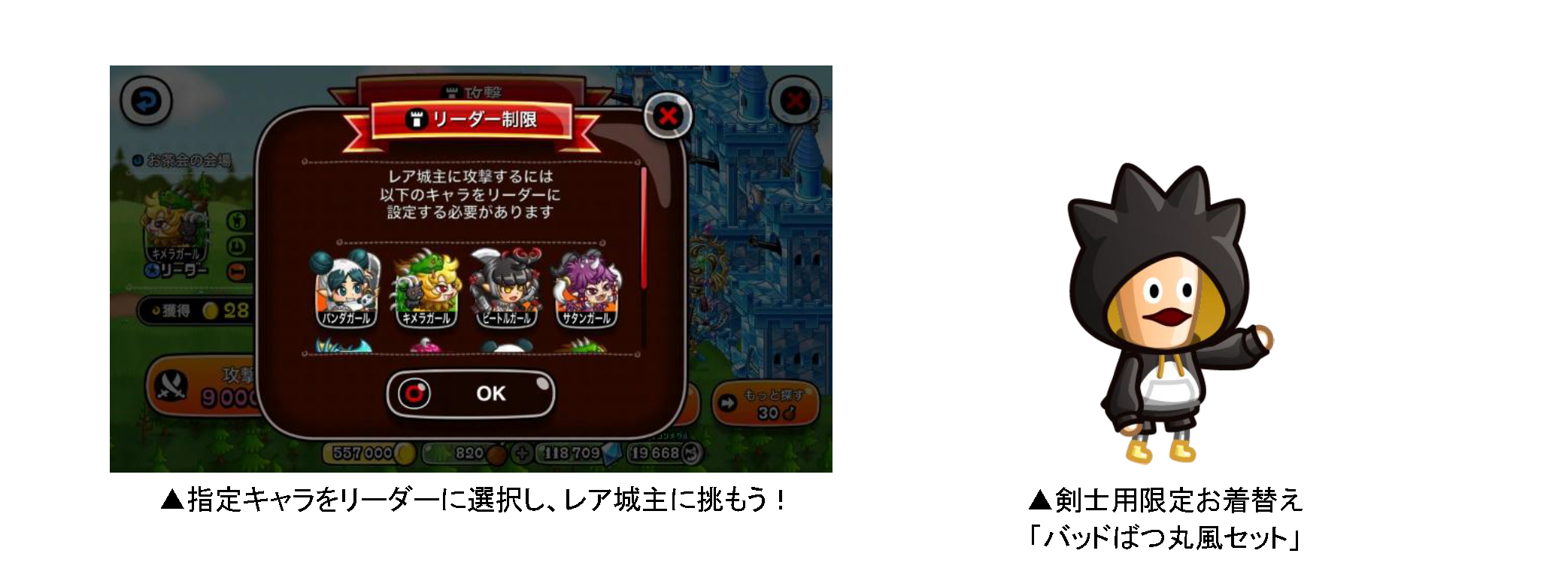 「バトル」から「ひとりで」または「みんなで」を選び、「攻撃」を選択すると、ランダムでレア城主が出現する「レア城主イベント」を開催いたします。まれに「特別な城」と遭遇し、条件をクリアすると剣士用限定お着替え「バッドばつ丸風セット」がもらえます。