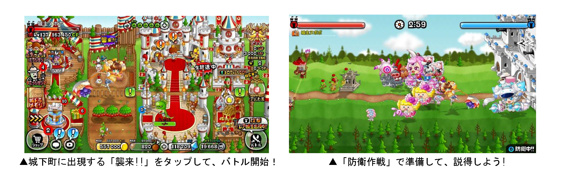 「サンリオキャラクターズ」に扮した城ドラのキャラたちが、アフタヌーンパーティー会場へ移動中ですが、準備が出来ていないため説得(バトル)をして一旦お引き取りいただきましょう!見事説得できると「ルビー」や「ドラゴンメダル」などの報酬を獲得することができます。「防衛作戦」で隊列を整えましょう!