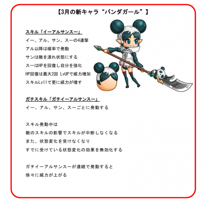 株式会社アソビズム(本社:東京都千代田区、代表取締役:大手智之)は、App Store・Google Playにて好評配信中の『城とドラゴン』で、3月の新キャラとなる“パンダガール”が2月28日(金)19:00よりゲーム内に登場することをお知らせいたします。