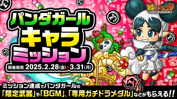 2月28日(金)19:00、『城ドラ』大人気の「ガールシリーズ」より“中型”キャラとしては第3弾となる新キャラ“パンダガール (CV: 林鼓子) ”がアバたまに登場します。スキル「イーアルサンスー」で最大4段攻撃まで可能な進撃キャラで、多段攻撃でダメージが増加する性能を備えています。登場を記念し、ミッションクリアで「限定の武器お着替え」や「BGM」、「専用ガチドラメダル」などがもらえる「キャラミッション」を開催!イベントに参加して新キャラクターの登場をお祝いしましょう!