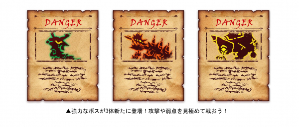 今回のアップデートで「グラディウス」「ナーガ」「ゴーレム」という3体のボスが登場します。それぞれ、強力な武器を持っているとか…。ボスの弱点を見極め、ヒーローと共に戦いに挑もう!