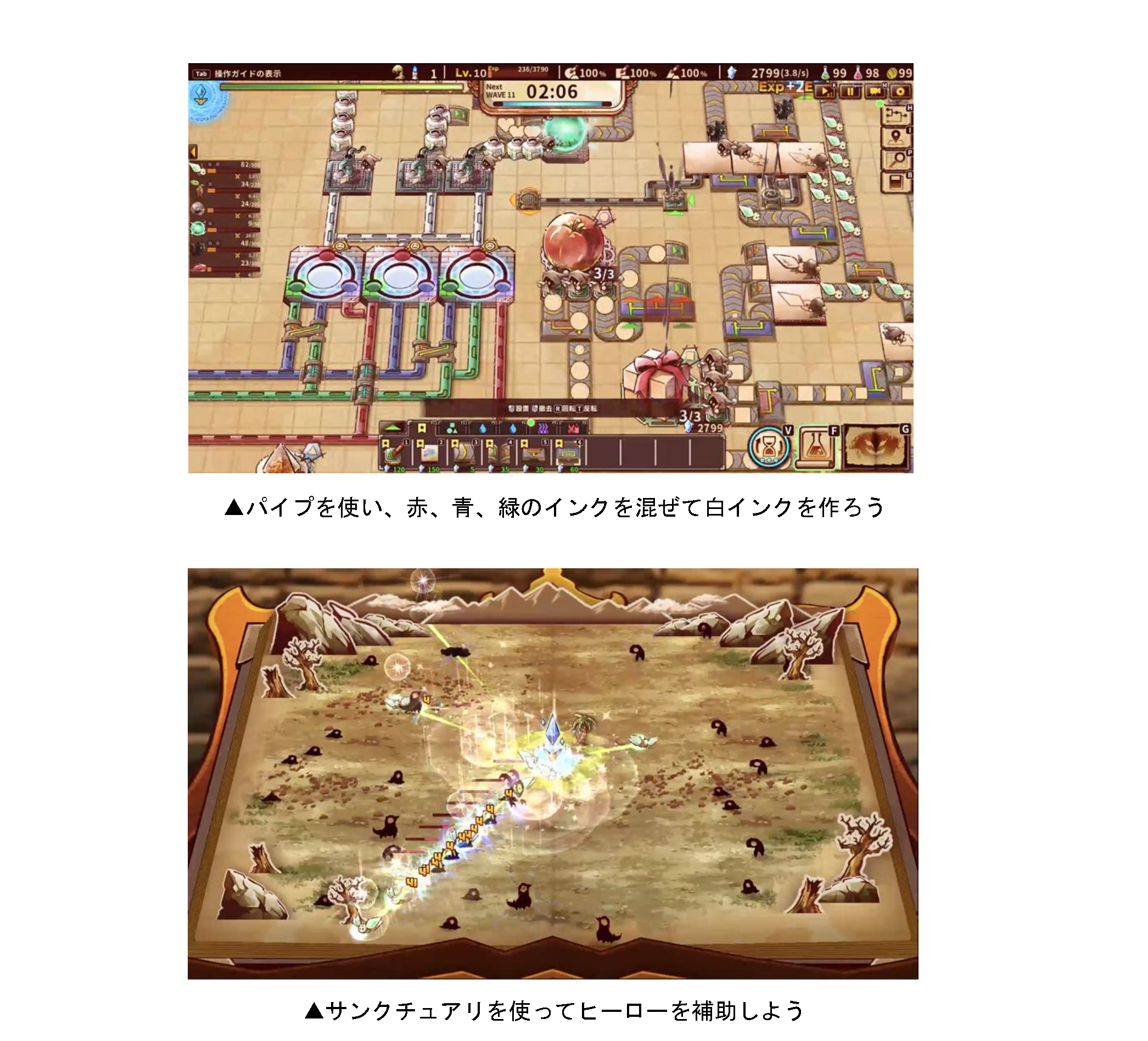 今回、パイプに関連した研究ツリーを新たに2つ追加します。「マンホール」や「反転パイプ」、「クロスパイプ」が使用できるようになることに加え、「アルベドメーカー」という新たなインク「白インク」を作る設備が登場!これにより、10個目のスペル「サンクチュアリ」の生成がかのうになります。「サンクチュアリ」はバトルにおいて一定範囲内にいるヒーローを不死身にするという、強力な効果があります。追加された研究ツリーやスペルを駆使して、強敵に挑みましょう!