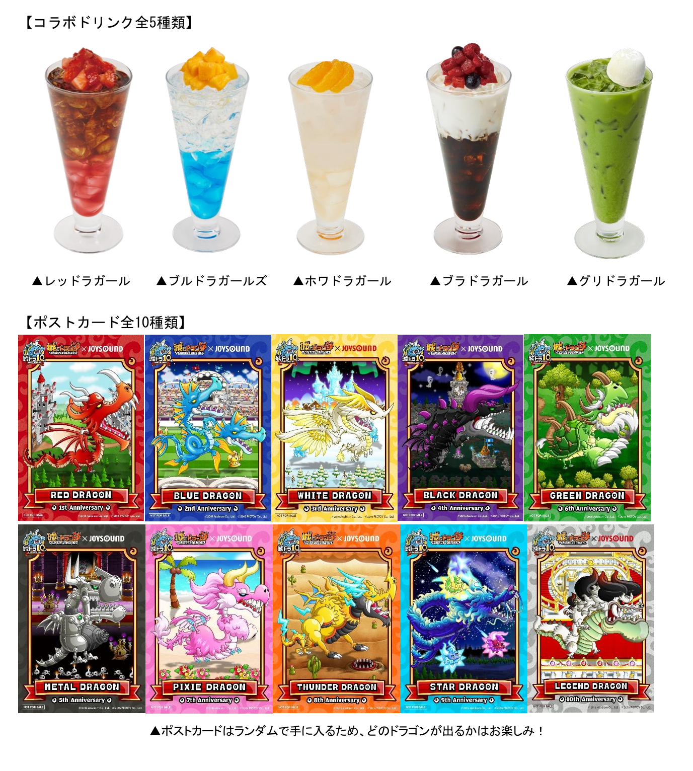 また、コラボメニューを注文するとアニバーサリーのドラゴンキャラがデザインされた「全10種のオリジナルポストカード」がランダムで1枚、「JOYSOUNDのアバたまチケット」がもらえるQRコードを 1枚プレゼント!