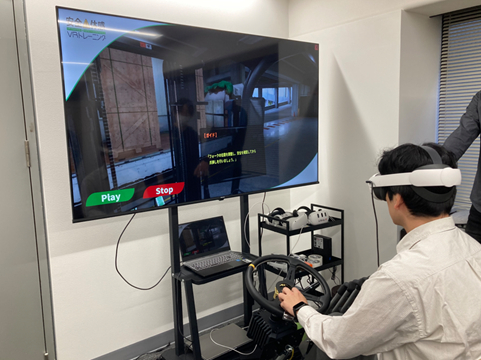 “リーチフォークリフト”に対応したVR安全教育(2023年運用開始済)に加え、この度、新規に開発した“カウンターフォークリフト” に対応したVRでは、「ハンドル」、「レバー」、「ペダル」を模したコントローラを操作し、会議室等の小さな空間で、荷扱い方法を習得することが可能になりました。