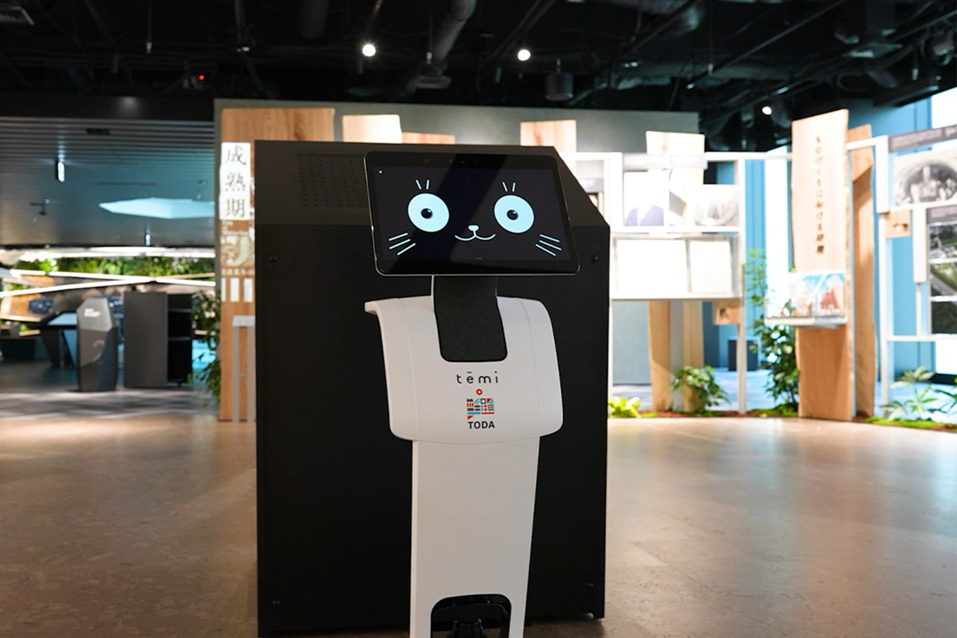 今回の「temi」の導入は、戸田建設グループの企業ミュージアム「TODA CREATIVE LAB “TODAtte?(トダッテ)”」に加え、同フロアにおける戸田建設の会議室エリアを対象としています。「temi」は、ミュージアムのアテンダント補助役として活躍し、展示エリアへの順路誘導や説明など、アテンダントとインタラクティブな掛け合いを行い、来館者に新しいミュージアム体験を提供します。また、同じフロアにある戸田建設の社員が利用する会議室への飲み物配送役としても活用され、業務効率化にも貢献します。