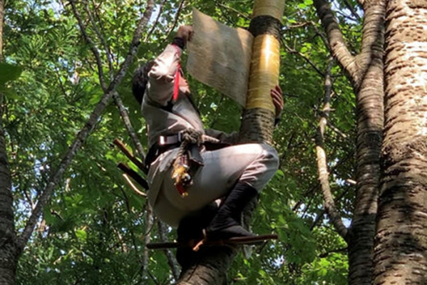 冨岡商店では山林の更新作業(主に伐採木はパルプ原料に使用)が行われる広葉樹林中の山桜から樹皮を採取しています。梅雨明けから9月頃の期間に職人が自ら山に入り、伐採前の山桜の木に登り樹皮を採取します。その後伐採された山桜は萌芽、株立ちをして数倍に増えます。