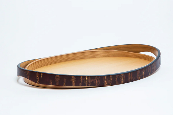 樺細工と大館曲げわっぱという秋田県の2つの伝統工芸がコラボレートしたトレイです。桜皮(山桜の樹皮)と秋田杉の2色構成によって美しいコントラストを生むと同時に、樺細工独特の表情を際立たせています。曲げわっぱをベースにして、その周囲に桜皮を貼った帯を重ねました。両側の帯を反り上げて少しずらすことで持ちやすくなり、見た目も軽快な印象になっています。