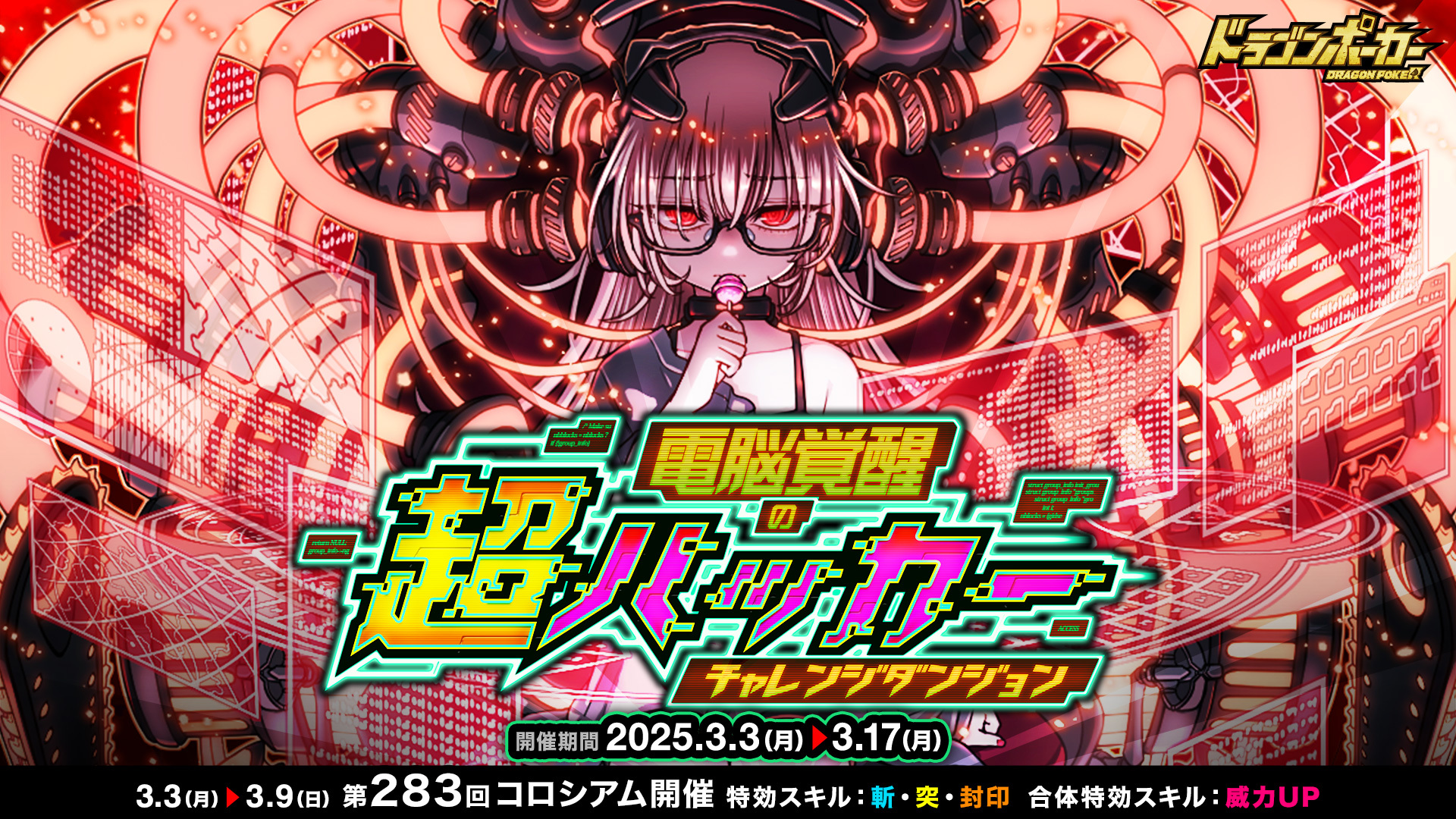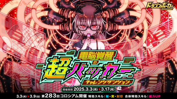 株式会社アソビズム(本社:東京都千代田区、代表取締役:大手智之)は、App Store・Google Playにて好評配信中のリアルタイム合体カードバトル『ドラゴンポーカー』で、2025年3月3日(月)より新チャレンジダンジョン「電脳覚醒の超ハッカー」を開催いたします。