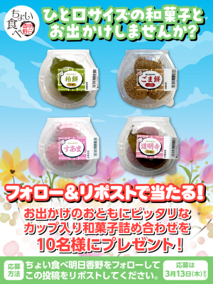 今回のキャンペーンでは、東日本地域の人気商品、ひと口サイズの和菓子シリーズ「和sweets」の4種類をセットにして10名様にプレゼントいたします。