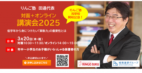 株式会社城南進学研究社(本社:神奈川県川崎市、代表取締役社長CEO:下村勝己。以下「当社」)が運営する算数塾「りんご塾」は、2025年3月20日(木・祝)、「りんご塾」浅草校が4月に新規開校することを記念して、田邉亨代表による「対面+オンライン講演会2025」を開催します。
