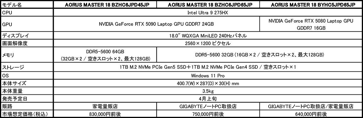 2025年3月7日 - GIGABYTE Technology Co., Ltd. 台湾・新北市 - コンピュータテクノロジーで世界をリードするGIGABYTE Technologyは、Intelの最新CPUであるIntel Core Ultra 9 275HXプロセッサとNVIDIAの最新GPUであるNVIDIA GeForce RTX 50シリーズを搭載し、AI機能を大幅に強化した18.0型ゲーミングノートPC「AORUS MASTER 18」シリーズ3製品の先行予約を3月7日に開始し、4月上旬より順次販売を開始いたします。