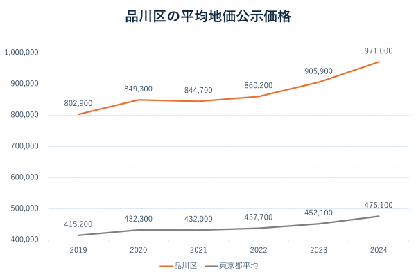 『VERXEED STAIR(ベルシードステアー)品川大崎』が建設された品川区は、東京都全体のなかでも高水準の地価を誇り、堅調な上昇傾向が続くエリアです。特に近年は東京都の平均を超える上昇率で推移しています。