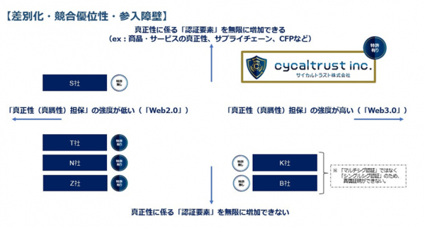 「鑑定証明システム」に係る複数特許取得済み技術は、製品・サービスの真正性(真贋性)を証明する「認証要素」を無限に増幅させることが可能という点において、他社との差別化・競合優位性・参入障壁を確立しております。