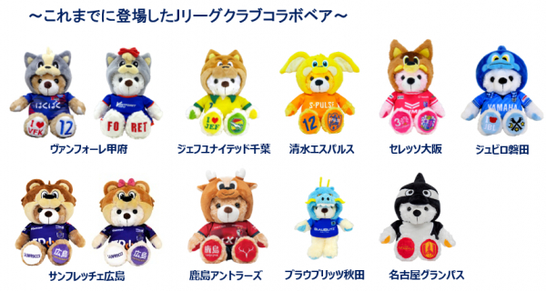 “旅の思い出”としてだけでなく、スポーツ観戦のお供に連れて行きたくなるようなご当地ベアを作りたいという想いから、Jリーグクラブマスコットとのコラボレーションが2017年に始まりました。これまで、ヴァンフォーレ甲府、ジェフユナイテッド千葉、清水エスパルス、セレッソ大阪、ジュビロ磐田、サンフレッチェ広島、鹿島アントラーズ、ブラウブリッツ秋田そして名古屋グランパスの9クラブのマスコットとのコラボベアが誕生しています。このたび、10クラブ目として、FC東京のクラブマスコット「東京ドロンパ」とコラボしたご当地ベアが新たに加わりました。今後も、各種スポーツ団体とのコラボレーションを通じて、全国にご当地ベアファンを増やしてまいります。