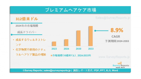 Survey Reports LLCは、2025年3月、プレミアムヘアケア市場の製品別(シャンプー、ドライシャンプー、ヘアカラー、コンディショナー、ヘアスタイリング剤、ヘアオイル、その他)セグメント、人口統計別(男性、女性、子供)セグメント、流通チャネル別(スーパーマーケットおよびハイパーマーケット、百貨店、専門店、薬局およびドラッグストア、オンライン、その他)セグメントに関する調査レポートを発行したと発表した プレミアムヘアケア市場の予測評価を提供する「グローバル市場分析、動向、機会、予測、2024年から2033年」である。プレミアムヘアケア市場の成長促進要因、市場機会、課題、脅威など、いくつかの重要な市場力学に焦点を当てている。