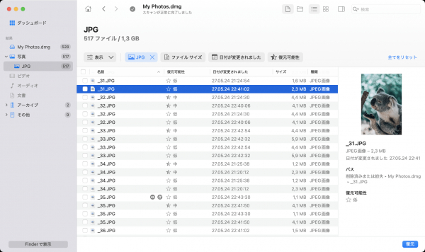 しかし、Tenorshare 4DDiG Macほどのファイル形式の幅広さや復元率の高さには及ばないため、複雑なデータ損失にはやや力不足かもしれません。