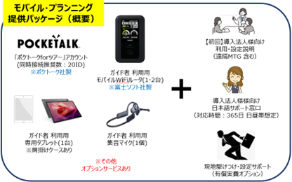 モバイル・プランニングは、本課題の解決に向けポケトークのAI同時通訳「ポケトーク for ツアー」に着目。富士ソフトとの協業にて利用に必要な機器・サービスの一括パッケージ化を図り、レンタル&サブスクプランを構築します。