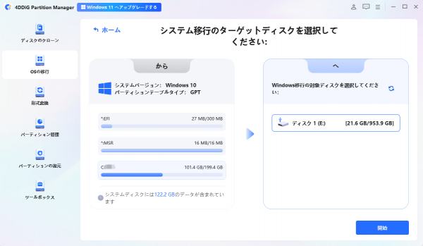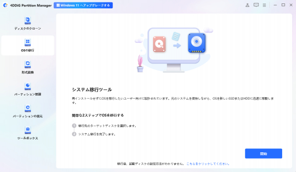 手順1.4DDiG Partition Managerをコンピュータにダウンロードしてインストールした後、新しいドライブを接続します。次に、アプリケーションを起動し、「OSの移行」を選択して「開始」をクリックします。
