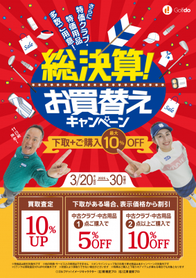 株式会社ゴルフ・ドゥ(本社:さいたま市 代表取締役社長:佐久間功)は、「総決算!お買替えキャンペーン」を2025年3月20日(木・祝)~30日(日)に、関東1都5県、兵庫県、九州4県にある「ゴルフドゥ!」23店舗において開催します。春のゴルフシーズンスタートに合わせて大変お得なお買替え特典をご用意するとともに、総決算ならではの特価クラブ、特価用品も大放出します。