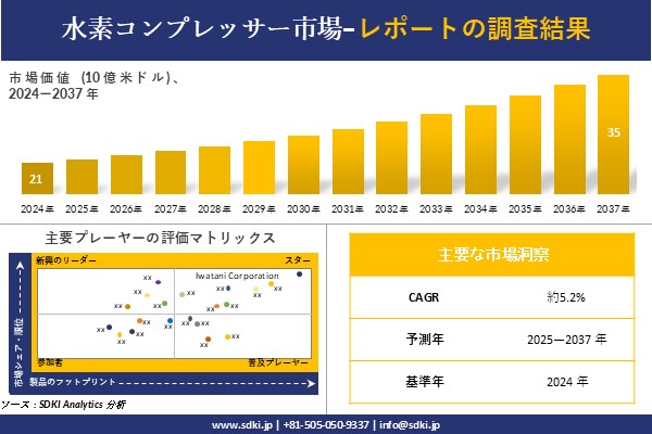 SDKI Analytics(本社:東京都渋谷区)は、このたび、2025年03月12に「水素コンプレッサー市場調査レポート:2025-2037年の市場規模、シェア、傾向の予測」を発表しました。水素コンプレッサーに関する市場調査レポートには、統計的および分析的アプローチを使用した予測評価が含まれています。この調査レポートでは、一次および二次調査方法を使用して分析された主要な業界洞察を通じて将来の傾向を理解できるようにすることで、主要な市場動向を読者に説明しています。