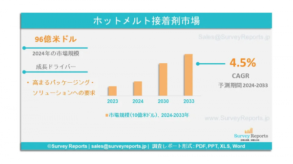 Surveyreportsの専門家はホットメルト接着剤市場の調査を分析し、2024年のホットメルト接着剤市場規模は96億米ドルに達すると予測した。さらに、ホットメルト接着剤市場のシェアは、2033年末までに143億米ドルに達すると予測されている。ホットメルト接着剤市場は、2024年から2033年の予測期間中に、年間平均成長率(CAGR)約4.5%で成長すると予測されている。