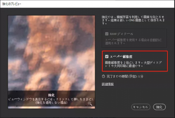 手順3:Camera Raw内で画像を右クリックし、「ニューラルフィルター」→「スーパー解像度」を適用。