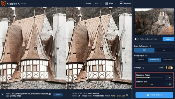 Topaz Gigapixel AIは、非常に高精度なAI技術を使用して、画像の解像度を最大6倍にアップスケールできます。特に、画像の細部やテクスチャーを忠実に再現し、元の品質を保ちながら拡大することができる点が特徴です。プロフェッショナル向けの強力なツールで、画像を自然に鮮明に仕上げるため、写真やデジタルアートのクオリティを大幅に向上させます。