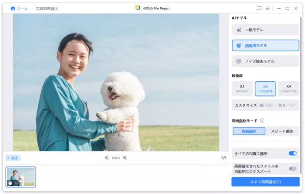 4DDiG File Repairなら、ワンクリックで写真の品質をアップスケールでき、解像度の向上やディテールの補正もスムーズに行えます。写真をより美しく、高精細にしたい方に、ぜひおすすめのツールです!