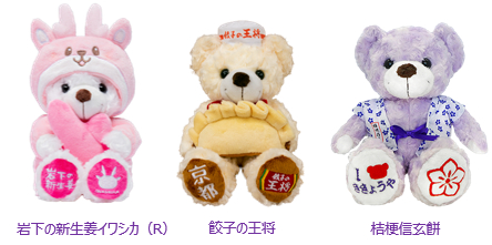 「ご当地ベア」は日本全国の「ご当地」で出会うことのできる“くまのぬいぐるみ”です。ご当地性のあるデザインを特徴に各地域の限定商品として販売しており、現在では300種類を超えるご当地ベアが誕生しています。岩下食品(栃木県)、餃子の王将(京都府)、桔梗屋(山梨県)など、ご当地の企業とコラボを行ったベアも次々と登場し、好評をいただいております。