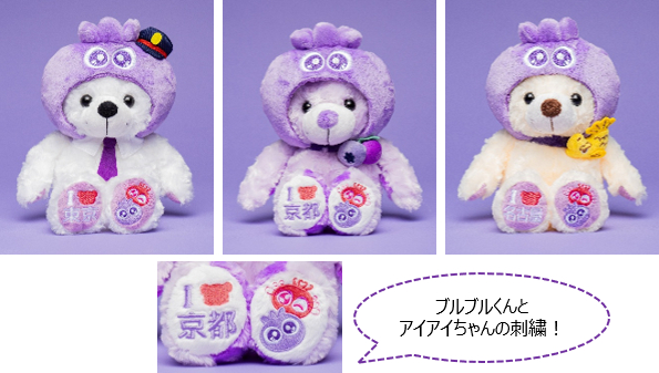 「東京」は、東京駅のポップアップストアで販売することから、車掌さんをイメージしたデザイン。「京都」は、わかさ生活の商品「ブルーベリーアイ」の原材料であるブルーベリーモチーフを首元に付け、「名古屋」は、首元に名古屋城の金シャチを付けています。