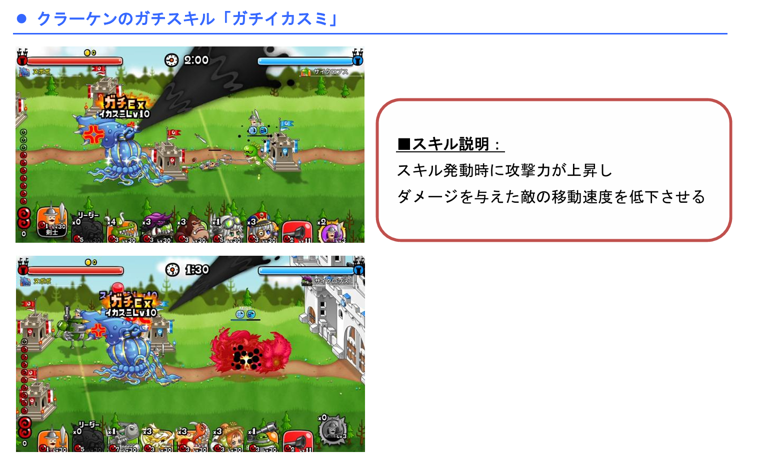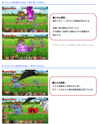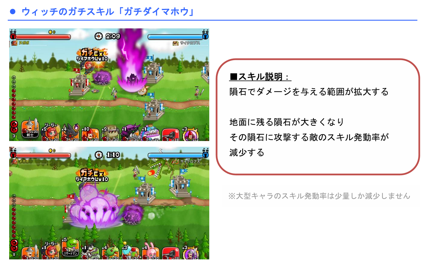 ガチスキルの実装に先駆け、ウィッチとクラーケンの通常スキルも改修!ウィッチの「ダイマホウ」は、空中のキャラ(※大型を除く)に当てた際に確率で地上に落とすことができるようになります。クラーケンの「イカスミ」は、スキルを受けたプレイヤーが画面に出る墨を雑巾で消すことが可能に。一方、「イカスミ」でダメージを受けたキャラは、「通常攻撃が確率で失敗する」状態異常が付与されます。それぞれのスキル改修については3月14日(金)メンテナンス後よりゲーム内に反映される予定です。