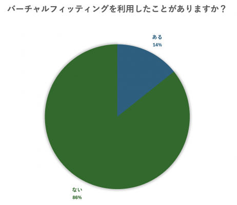 バーチャルフィッティングの知名度と利用経験のアンケートについて、バーチャルフィッティングを知っている人は56%で、半数以上を占めていることが分かりました。しかし、実際に利用したことがある人は14%にとどまり、サービスの利用はまだ十分に広まっていないことが明らかとなりました。