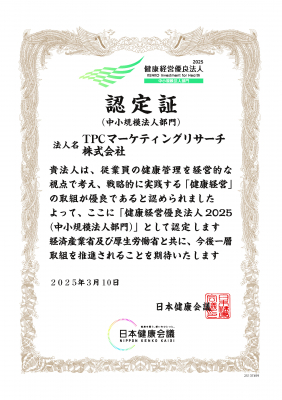 この程、TPCマーケティングリサーチ株式会社(本社=大阪市西区、代表取締役社長=松本竜馬)は、2025年3月10日付で経済産業省と日本健康会議が共同で実施する「健康経営優良法人認定制度」より、中小規模法人部門における「健康経営優良法人2025」に認定されました。