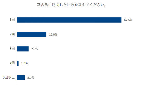 宮古島に訪れた回数をたずねたところ、「1回」67.5%、「2回」19%、「3回」7.5%、「4回」1.0%、「5回以上」5.0%という結果でした。