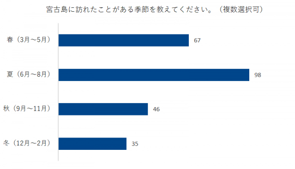 宮古島を訪問した季節として、夏(6月~8月)を選択した回答者は98人でした。次いで春(3月~5月)67人、秋(9月~11月)46人、冬(12月~2月)35人と続きます。