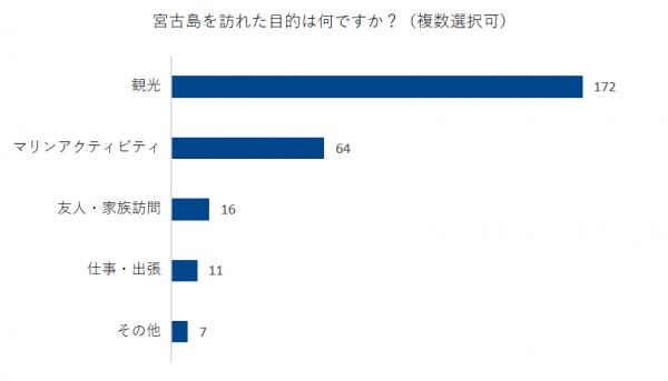 宮古島を訪れる目的としては、「観光」が172人と圧倒的に多く、次いで「マリンアクティビティ」が64人、「友人・家族訪問」16人、「仕事・出張」11人、「その他」7人でした。その他として、「リアル脱出ゲームへの参加」や「ウエディングフォトの撮影」、「大学のインターンシップ」といった回答がありました。