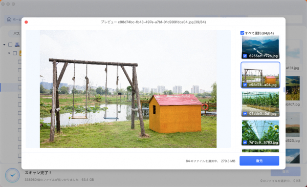 手順2.スキャンが完了すると、復元可能なファイルが一覧表示されます。写真屋動画などのファイルの種類や名前で絞り込み、プレビュー機能で内容を確認できます。