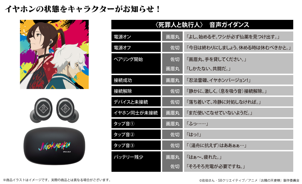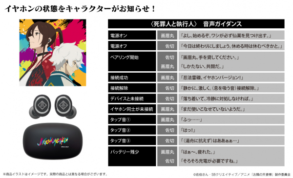 本コラボレーションモデルは、「<死罪人と執行人>画眉丸・佐切」の特別モデルとなっており、充電ケース天面に「スプレーペイント風英字デザイン」を印刷加工、左右ハウジングに「画眉丸と佐切のモチーフ」をレーザー加工で施しています。ハウジングは起動時にLEDが点灯する仕様です。音声ガイダンスには、「画眉丸」(CV:小林千晃)と「佐切」(CV:花守ゆみり)の録り下ろしボイスを搭載しており、電源オン・オフ、ペアリング時、タップ音など、計11種類の音声が楽しめます。さらに、パッケージは本コラボモデルのために描き下ろした特別なイラストを採用しています。