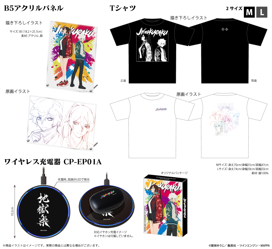 また、同時にワイヤレス充電対応製品を載せるだけで充電できる「ワイヤレス充電器」を受注販売、描き下ろしイラストと原画イラストを使用した「Tシャツ」「B5アクリルパネル」を通常販売いたします。